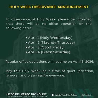 Today, Liceo del Verbo Divino (LVD) is acclaimed as the Landmark of Catholic Education in Eastern Visayas. LVD offers Basic Education (Pre-Elementary, Elementary and High School) grounded on Gospel Values.